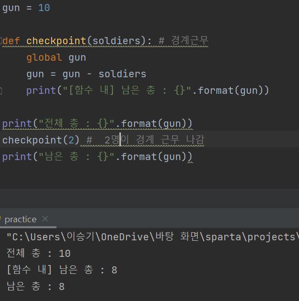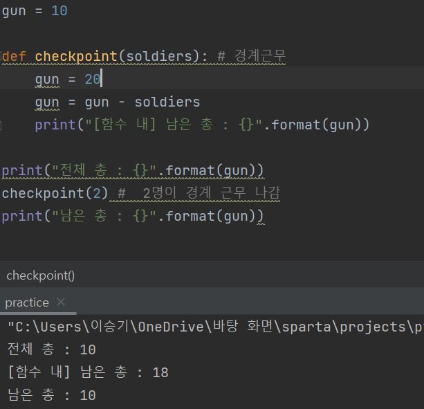 전체 총과 남은 총의 print는 checkpoint 함수 내에 적용된 것이 아니기 때문에 첫줄의 gun = 10이 적용