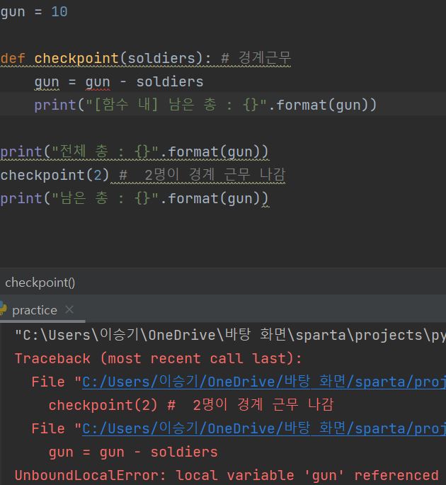 gun = gun - soliders에서 gun은 첫줄 gun = 10의 gun과 별개로 checkpoint라는 함수 내에서만 정의된 gun(지역변수)