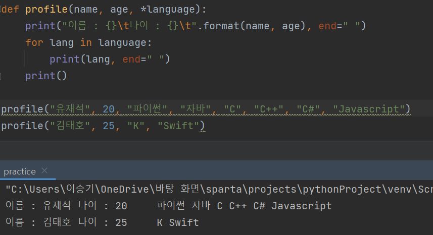 정의된 함수의 키 순서에 무관하게 키워드에 해당하는 값을 = 형식으로 입력해도 정상적으로 출력됨