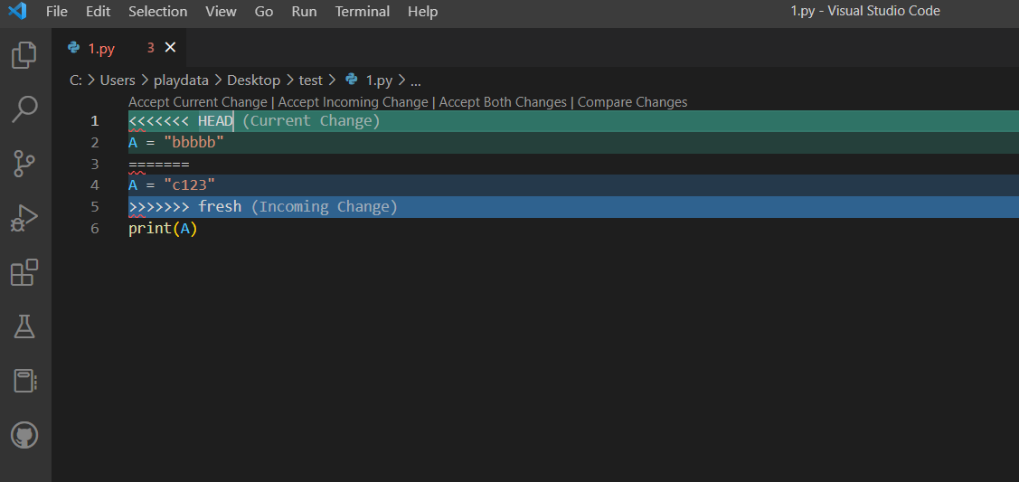- Accept Current Change = 현재 브렌치 코드 적용, Accept Incoming Change = 외부 브렌치 코드 적용,