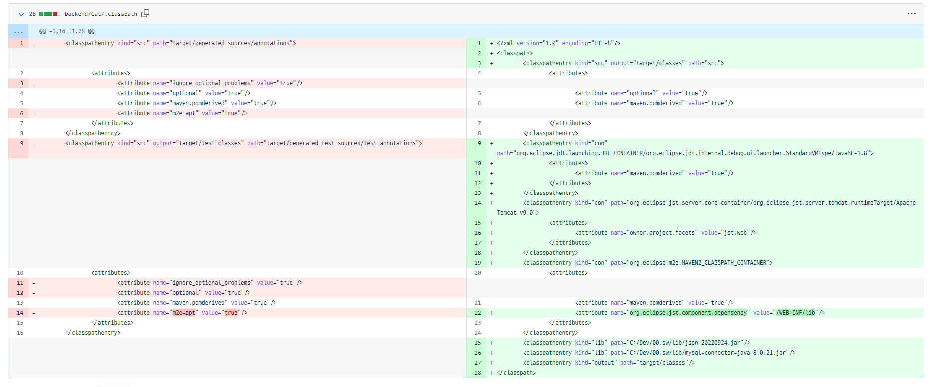 9. git commit 및 pull을 하고난 후 갑자기 아파치 컴뱃 서버 구동이 안되는 것은 물론 Cat 프로젝트에 있던 Java 라이브러리들이 모두 사라지는 문제를 경험 => 몇시간동안 원인도 제대로 파악 못하고 있다가 이클립스 에러창에 classpath 관련 글이 보이길래 깃허브에서 확인해보니 classpath 파일 내용이 바껴있었고 변경전 코드를 복사하여 classpath 파일에 붙여넣더니 없어졌던 라이브러리가 다시 나타났고 서버도 다시 잘 구동되었음.