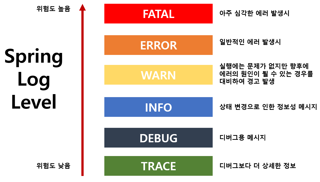 - 각 Log Level에 따른 log 출력값에 대한 설정을 할 수 있음 (trace, debug, info, warn, error) -> fatal은 X