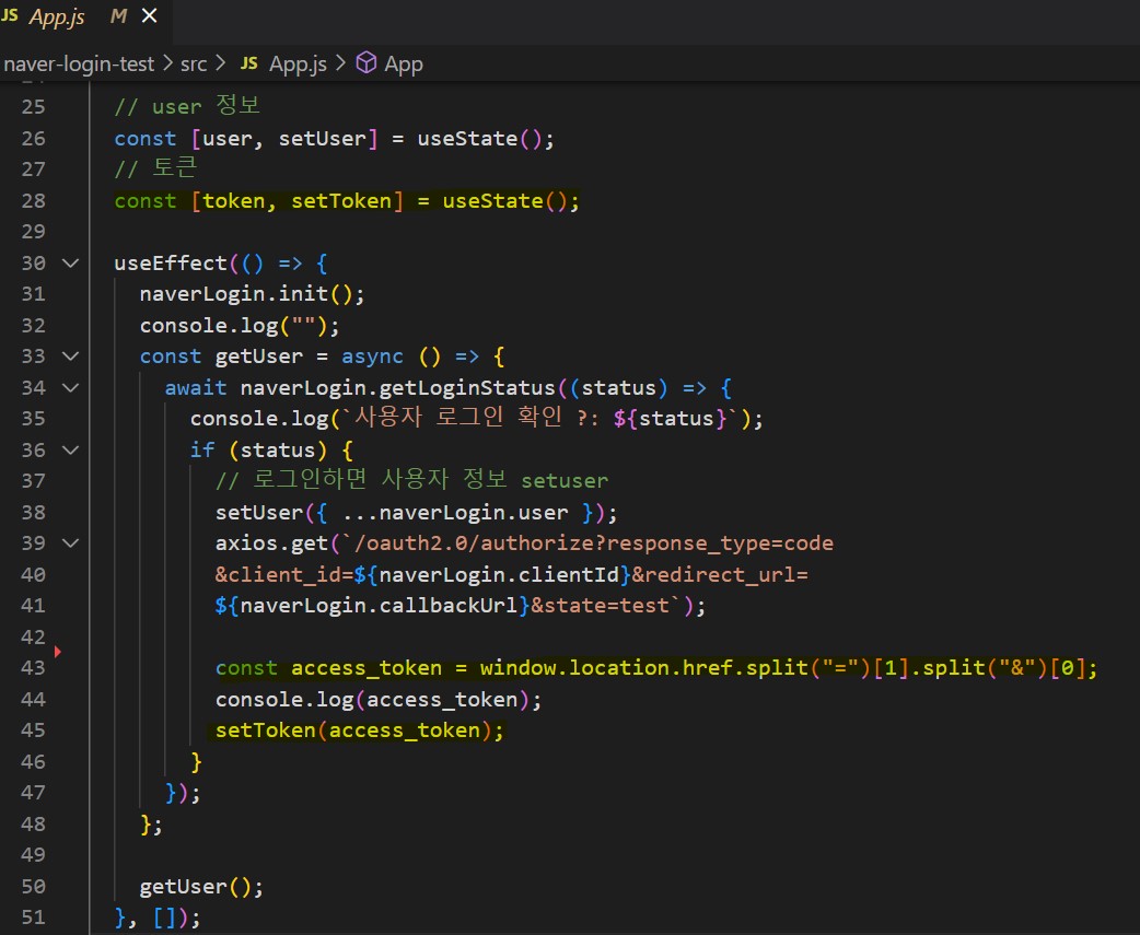 겨우 과정을 이해하고 작업을 시작했는데 처음부터 난관에 부딪쳤다. 접근 토큰이 보안상 JSON 객체로 반환되지 않고 요청시에 URL 주소값이 바뀌면서 반환되는 것이었는데 (처음에는 user.id로 반환되는 데이터와 접근 토큰이 같은 데이터인 줄 알고 작업했다가 계속 API 호출을 거부당했는데 뒤늦게 서로 다른 데이터임을 눈치채 이 부분을 이해하는데까지 상당한 시간이 소요됐다..) 구글링을 통해 방법을 찾아보니 window.location.href를 이용하여 해당 url을 추출하여 split을 이용해 접근 토큰에 대한 데이터만 추출할 수 있었다.