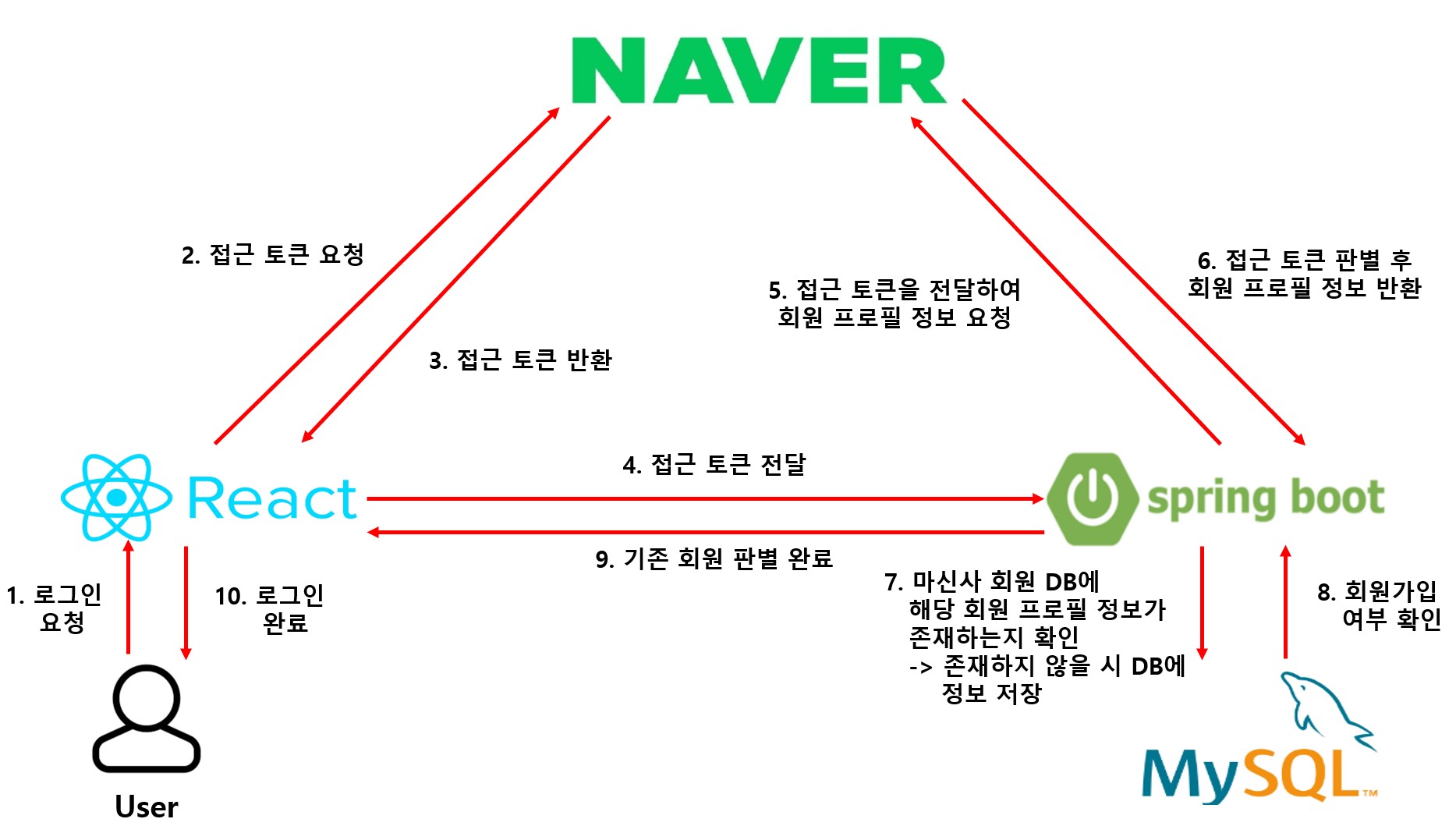 알고보니 주말동안 내가 찾았던 정보들은 React 사용 없이 Spring Boot만을 이용하여 작업할 수 있는거라 적용 불가능하였고 결국 나 스스로 방법을 찾아내야했다. 그렇게 프론트 팀원들과의 잦은 대화를 통해 네아로 실행 과정을 겨우 이해할 수 있었는데 다음과 같았다.
