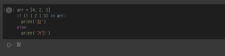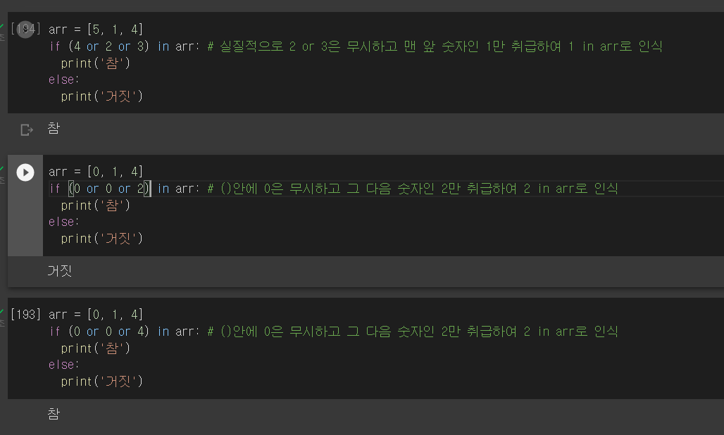 ()안에 or를 사용하면 맨 앞 텍스트만 인식. 그래서 첫번째 경우에는 4 in arr로 인식 -> 참