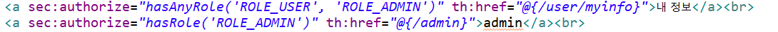 - hasAnyRole() = 지정한 권한들 중에서 하나라도 있을 경우 출력