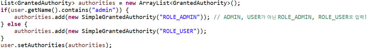 => 그렇지 않으면 authorities에 SimpleGrantedAuthority 객체를 추가한 뒤 User 객체에 Set을 해도 오류는 발생하지 않지만 적용이 제대로 되지 않음