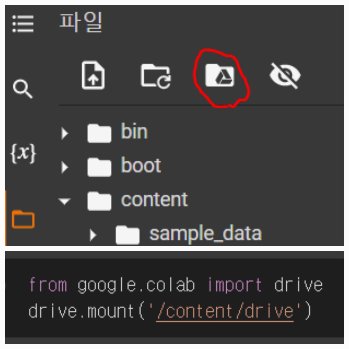 1. 해당버튼(드라이브 마운트 버튼)을 통해 mount를 실행하여 나의 구글 드라이브와 연동