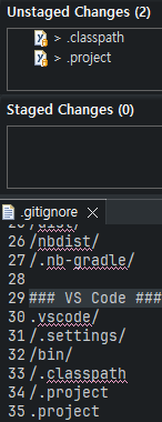 다음과 같이 .gitignore에 .classpath와 .project에 대해 설정을 해주었는데도 Eclipse에서 Unstaged Changes에 그대로 추적이 되는 상황이 발생