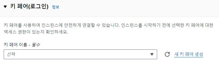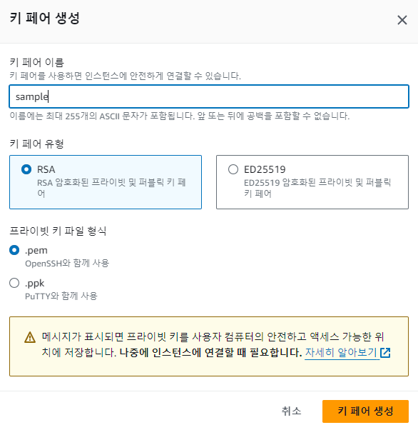 2. 보안을 위해 새 키 페어 생성 클릭 → 다음과 같이 기본값으로 설정 후 키 페어 생성