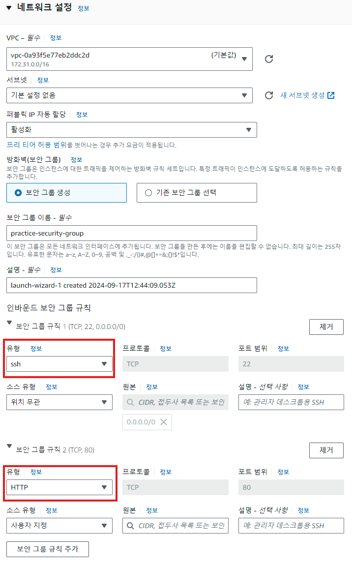 3. 네트워크 설정에서 편집 클릭 → 보안 그룹 생성 옵션 선택 → 보안 그룹 규칙 추가를 통해 ssh와 http 트래픽 허용