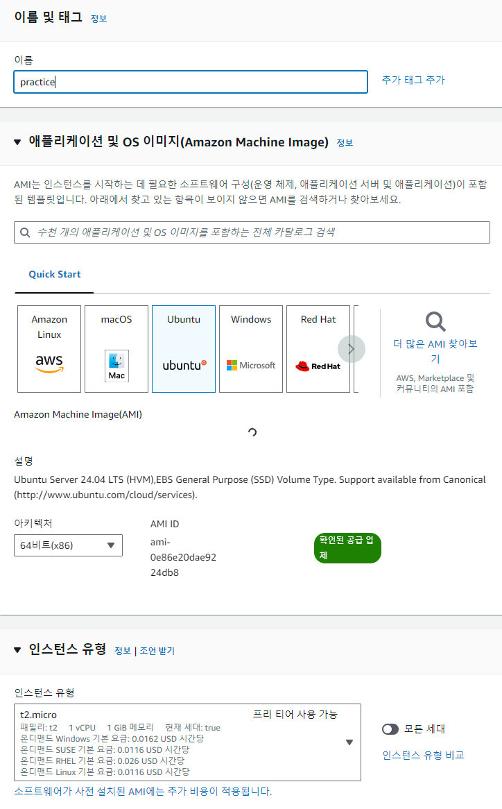 (OS 종류: Ubuntu, 인스턴스 유형: t2-micro)