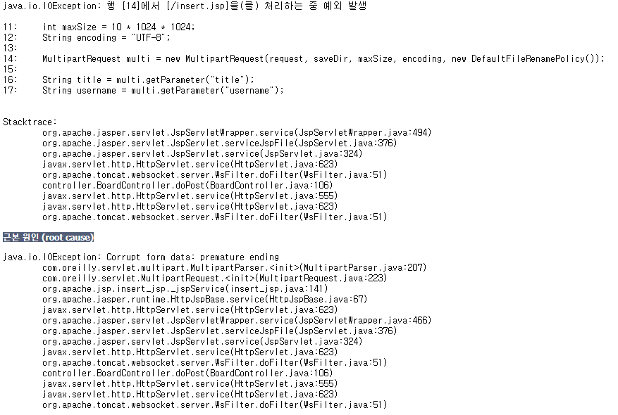 게시글 작성 페이지(write.jsp)에서 Controller와 insert.jsp를 거쳐서 dao.insertData() 실행하려는 동안 MultipartRequest 객체가 두 번 생성되었던 것이 원인