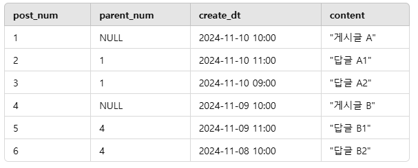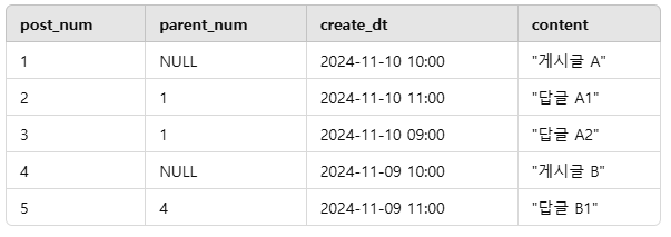 → parent_num이 NULL(부모 게시글)이면 create_dt 기준 내림차순, parent_num이 NOT NULL(답글)이면 create_dt 기준 오름차순 정렬