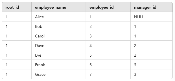 SELECT CONNECT_BY_ROOT employee_id AS root_id, employee_name, employee_id, manager_id