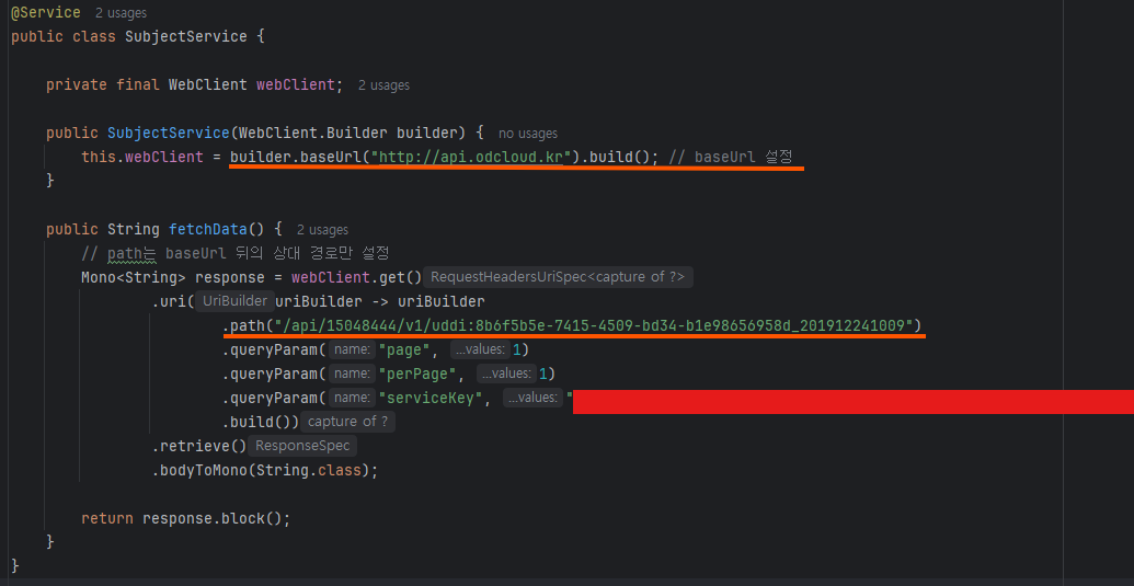 다음과 같이 baseUrl에는 API의 기본 URL을 입력하고 나머지 상대경로는 UriBuilder.path()로 지정