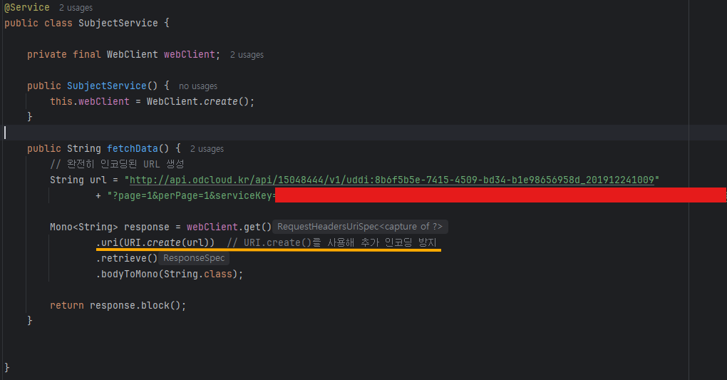 OPEN API 접근 승인에 필요한 serviceKey의 값을 WebClient가 .queryParam()에서 추가 인코딩 진행