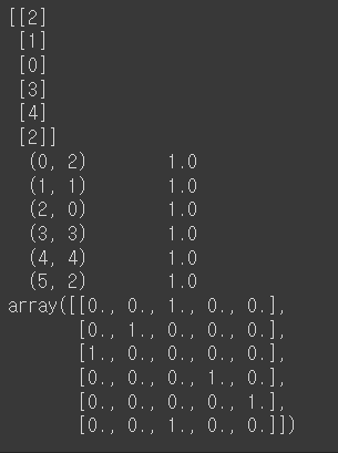onehot.toarray() = 최종적으로 데이터를 행렬로 변환